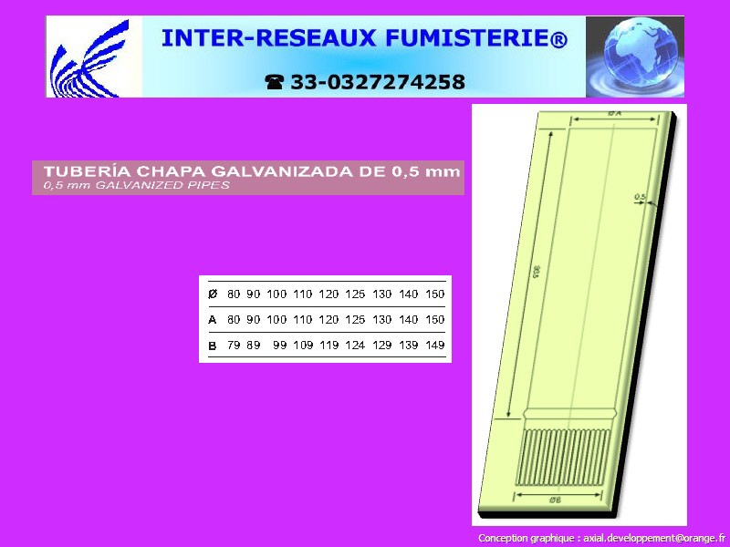 (tuyau simple paroi acier galvanisé pour conduit évacuation fumées OU de ventilation) Ce produit est du tuyau rigide simple paroi pour créer un conduit d'évacuation des fumées OU de ventilation. Les diamètres indiqués sont spécifiés en millimètre. En cas de doute sur votre conception, contactez notre service technique au 33 - 03.27.27.42.58 Pour voir le plan non contractuel, cliquez ICI