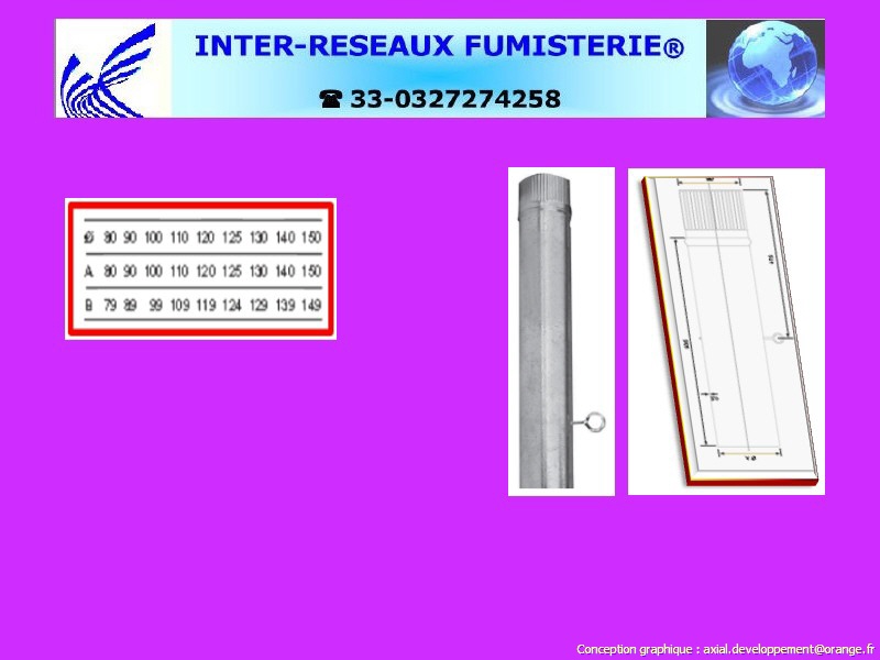 (tuyau simple paroi acier galvanisé pour conduit évacuation fumées OU de ventilation) Ce produit est du tuyau rigide simple paroi pour créer un conduit d'évacuation des fumées OU de ventilation. Les diamètres indiqués sont spécifiés en millimètre. En cas de doute sur votre conception, contactez notre service technique au 33 - 03.27.27.42.58 Pour voir le plan non contractuel, cliquez ICI