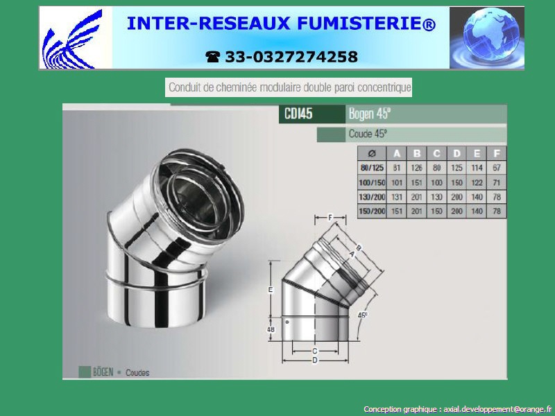 (coude double paroi inox Aisi-316L Série CO330 pour conduit de cheminée modulaire concentrique évacuation fumées) Le conduit de cheminée BOFILL série DI est un conduit modulaire composé de deux cylindres concentriques en acier inoxydable Aisi-316L cylindre interne et Aisi-304 cylindre extérieur, soudés au laser longitudinalement (une garantie pour la fermeture correcte des cylindres et pour l'étanchéité parfaite de chacun d'eux). L'évacuation des gaz de l'appareil se fait par le conduit interne et l'entrée d'air pour la combustion, par la cavité formée entre les deux cylindres. Il possède une excellente résistance à la corrosion résultant de la teneur en soufre des gaz condensés et de la PdC du fioul. Il est équipé d'un système d'assemblage étanche type "clic" avec un joint en silicone dans le conduit interne qui résiste à des températures allant jusqu'à 200°C. Les diamètres indiqués sont spécifiés en millimètre. En cas de doute sur votre conception, contactez notre service technique au 33 - 03.27.27.42.58 Pour voir le plan non contractuel, cliquez ICI