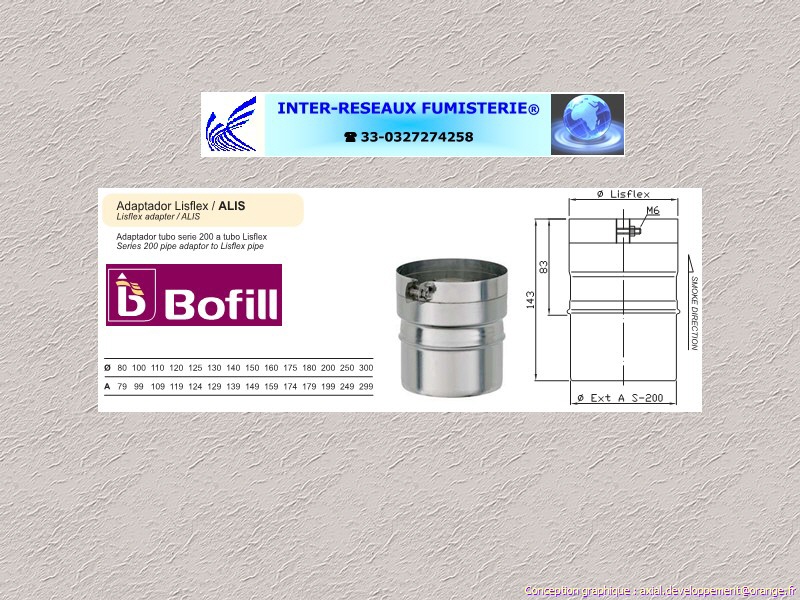 (adaptateur INTERLIS pour conduit évacuation fumées simple paroi rigide>flexible) Ce produit est un accessoire de raccordement pour du tuyau rigide simple paroi servant à créer un conduit d'évacuation des fumées. Les diamètres indiqués sont spécifiés en millimètre. En cas de doute sur votre conception, contactez notre service technique au 33 - 03.27.27.42.58 Pour voir le plan non contractuel, cliquez ICI