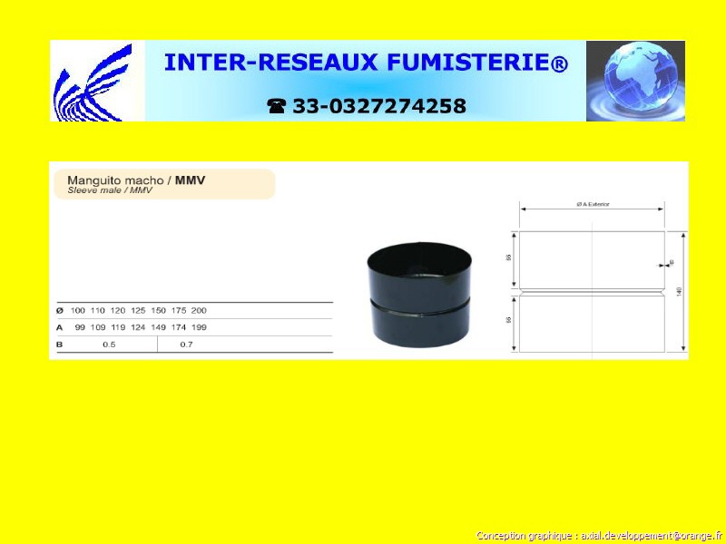 (manchon mâle pour conduit évacuation fumées simple paroi vitrifié à 900° noir brillant) Ce produit est un accessoire de raccordement pour du tuyau rigide simple paroi servant à créer un conduit d'évacuation des fumées. Les diamètres indiqués sont spécifiés en millimètre. En cas de doute sur votre conception, contactez notre service technique au 33 - 03.27.27.42.58 Pour voir le plan non contractuel, cliquez ICI
