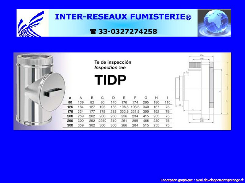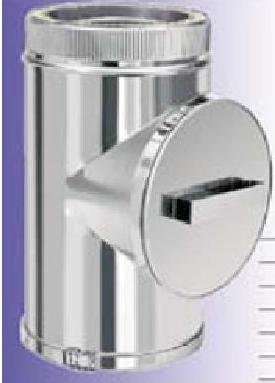 (té d'inspection pour conduit évacuation fumées double paroi inox/inox AISI-304) Ce produit est un accessoire de raccordement pour du tuyau rigide double paroi servant à créer un conduit d'évacuation des fumées. Les diamètres indiqués sont spécifiés en millimètre. En cas de doute sur votre conception, contactez notre service technique au 33 - 03.27.27.42.58 Pour voir le plan non contractuel, cliquez ICI