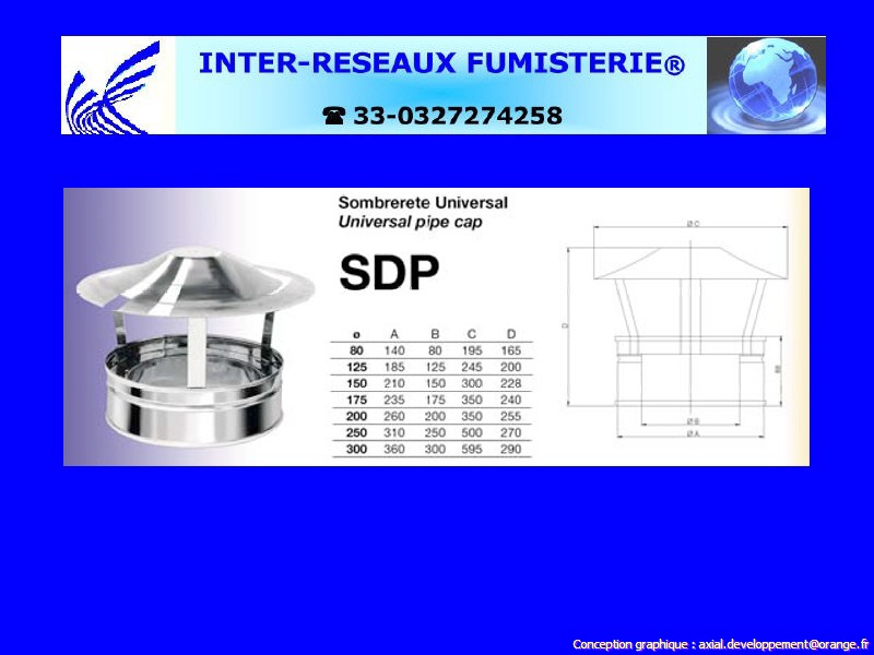 (chapeau universel pour conduit évacuation fumées double paroi inox/inox AISI-316) - Attention ! les références sont codifiées en Aisi-304 - Changement de nomenclature prochainement du diamètre 80 à 300. Ce produit est un accessoire de raccordement pour du tuyau rigide double paroi servant à créer un conduit d'évacuation des fumées. Les diamètres indiqués sont spécifiés en millimètre. En cas de doute sur votre conception, contactez notre service technique au 33 - 03.27.27.42.58 Pour voir le plan non contractuel, cliquez ICI