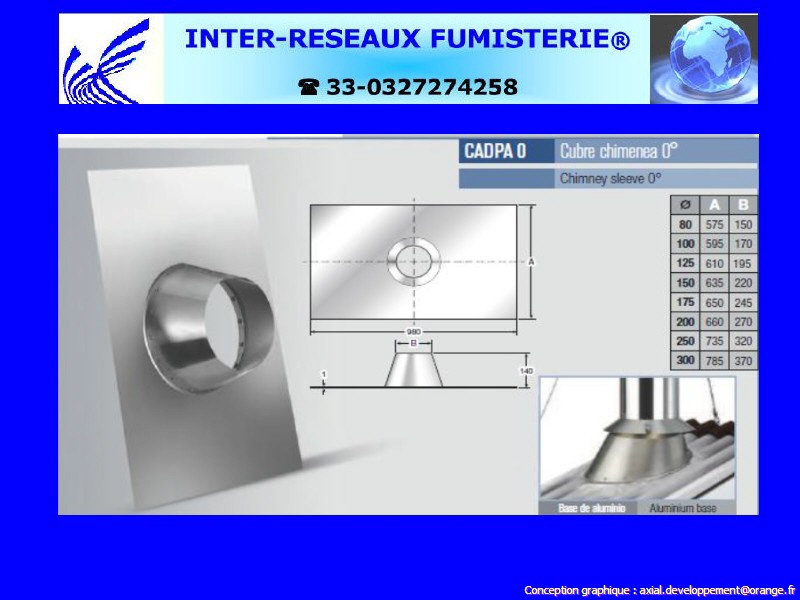 (sortie de cheminée base aluminium de 0° pour conduit évacuation fumées double paroi inox/inox AISI-304) Ce produit est un accessoire de raccordement pour du tuyau rigide double paroi servant à créer un conduit d'évacuation des fumées. Les diamètres indiqués sont spécifiés en millimètre. En cas de doute sur votre conception, contactez notre service technique au 33 - 03.27.27.42.58 Pour voir le plan non contractuel, cliquez ICI