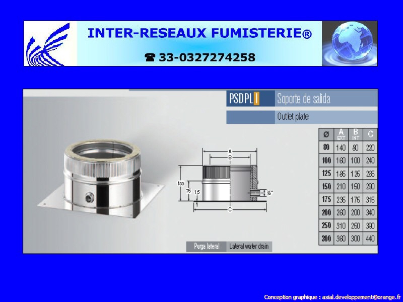 (support de dalle ou plaque de démarrage de sol avec purge latérale pour conduit évacuation fumées double paroi inox/inox AISI-316) - Attention ! les références sont codifiées en Aisi-304 - Changement de nomenclature prochainement Ce produit est un accessoire de raccordement pour du tuyau rigide double paroi servant à créer un conduit d'évacuation des fumées. Les diamètres indiqués sont spécifiés en millimètre. En cas de doute sur votre conception, contactez notre service technique au 33 - 03.27.27.42.58 Pour voir le plan non contractuel, cliquez ICI