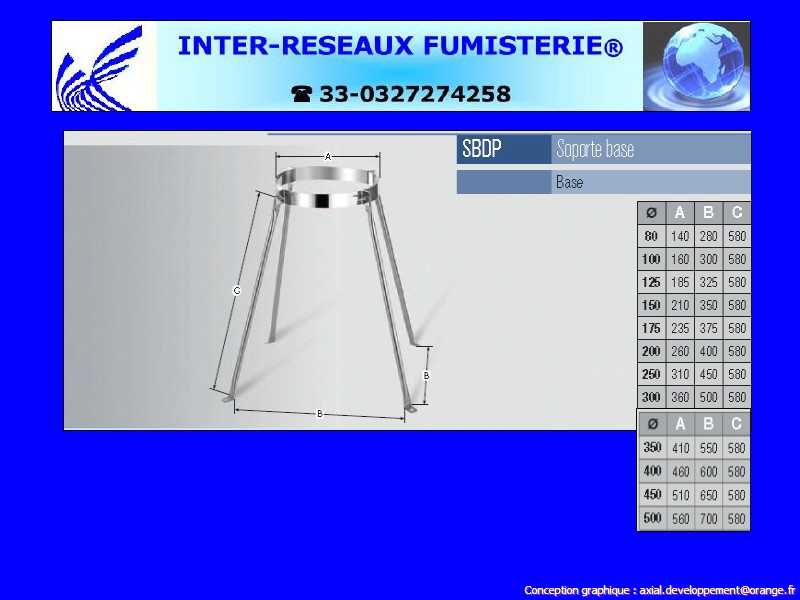 (pied de soutien pour conduit évacuation fumées double paroi inox/inox AISI-304) Ce produit est un accessoire de raccordement pour du tuyau rigide double paroi servant à créer un conduit d'évacuation des fumées. Les diamètres indiqués sont spécifiés en millimètre. En cas de doute sur votre conception, contactez notre service technique au 33 - 03.27.27.42.58 Pour voir le plan non contractuel, cliquez ICI