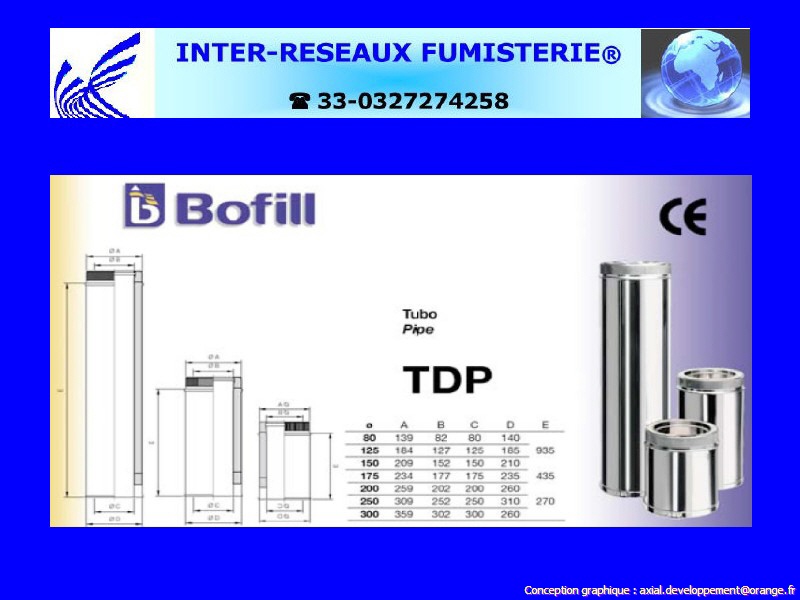 (tuyau double paroi série 400 pour conduit évacuation fumées OU de ventilation) Le conduit de cheminée polycombustible modulaire BOFILL est fondamentalement constitué de deux cylindres concentriques en acier inoxydable fermés aux extrémités, et d'une coquille isolante remplie de laine de roche d'une épaisseur de 30 mm et d'une densité de 150 kg/m3. Ce produit est du tuyau rigide double paroi pour créer un conduit d'évacuation des fumées. Les diamètres indiqués sont spécifiés en millimètre. En cas de doute sur votre conception, contactez notre service technique au 33 - 03.27.27.42.58 Pour voir le plan non contractuel, cliquez ICI
