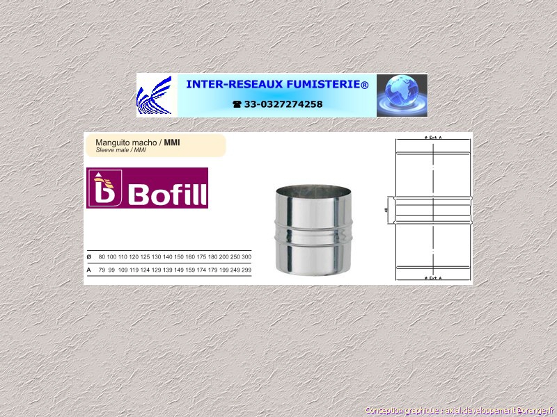 manchon mâle pour conduit évacuation fumées simple paroi inox Aisi-304 Série 200 Ce produit est un accessoire de raccordement pour du tuyau rigide simple paroi servant à créer un conduit d'évacuation des fumées. Les diamètres indiqués sont spécifiés en millimètre. En cas de doute sur votre conception, contactez notre service technique au 33 - 03.27.27.42.58 Pour voir le plan non contractuel, cliquez ICI