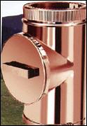 té d'inspection 90° série C500 double paroi inox Aisi-304 sur le cylindre intérieur et cuivre véritable sur le cylindre extérieur) Ce produit est un accessoire de raccordement pour du tuyau rigide double paroi servant à créer un conduit d'évacuation des fumées. Les diamètres indiqués sont spécifiés en millimètre. En cas de doute sur votre conception, contactez notre service technique au 33 - 03.27.27.42.58 Pour voir le plan non contractuel, cliquez ICI