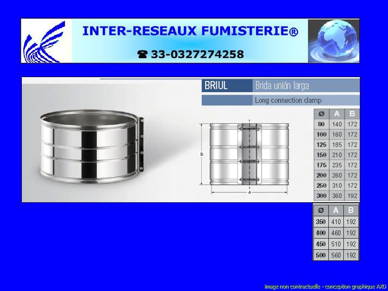 bride d'union longue double paroi isolé série 400 Ce produit est un accessoire de raccordement pour du tuyau rigide double paroi servant à créer un conduit d'évacuation des fumées. Les diamètres indiqués sont spécifiés en millimètre. En cas de doute sur votre conception, contactez notre service technique au 33 - 03.27.27.42.58 Pour voir le plan non contractuel, cliquez ICI