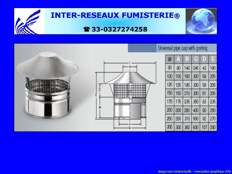 chapeau universel avec grille double paroi isolé série 400 Ce produit est un accessoire de raccordement pour du tuyau rigide double paroi servant à créer un conduit d'évacuation des fumées. Les diamètres indiqués sont spécifiés en millimètre. En cas de doute sur votre conception, contactez notre service technique au 33 - 03.27.27.42.58 Pour voir le plan non contractuel, cliquez ICI