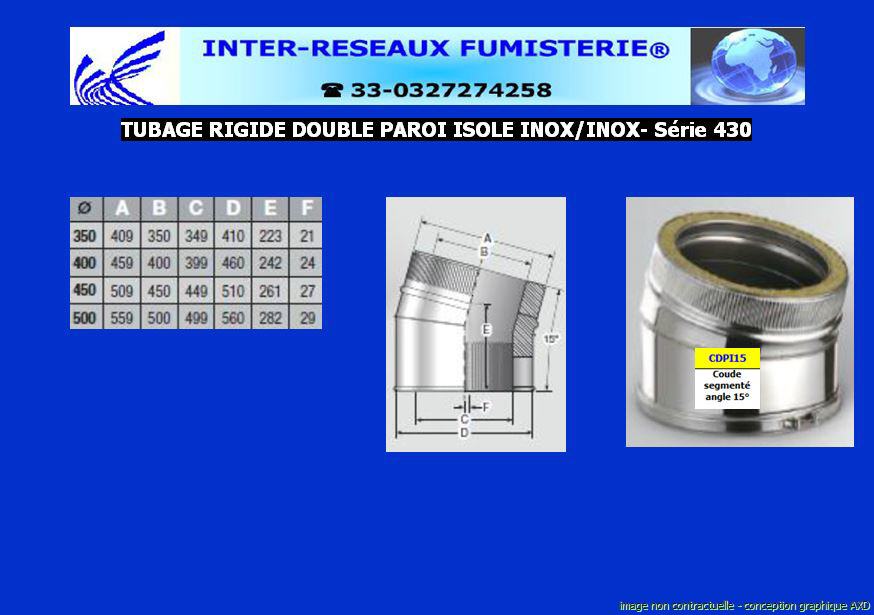 coude double paroi isolé série 430 Ce produit est un accessoire de raccordement pour du tuyau rigide double paroi servant à créer un conduit d'évacuation des fumées. Les diamètres indiqués sont spécifiés en millimètre. En cas de doute sur votre conception, contactez notre service technique au 33 - 03.27.27.42.58 Pour voir le plan non contractuel, cliquez ICI