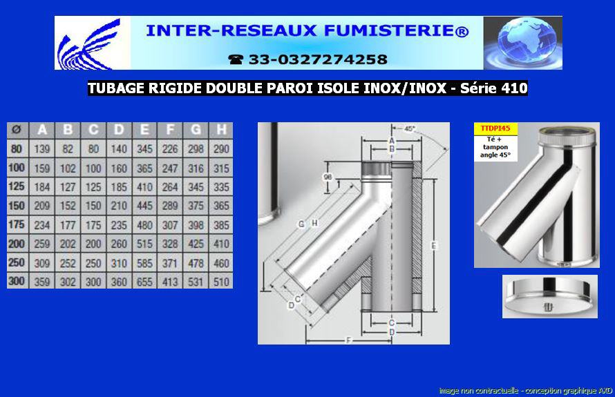 té + purge double paroi isolé série 410 Ce produit est un accessoire de raccordement pour du tuyau rigide double paroi servant à créer un conduit d'évacuation des fumées. Les diamètres indiqués sont spécifiés en millimètre. En cas de doute sur votre conception, contactez notre service technique au 33 - 03.27.27.42.58 Pour voir le plan non contractuel, cliquez ICI