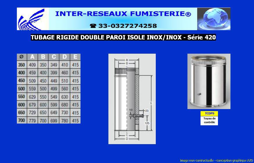 (tuyau de contrôle double paroi isolé série 420) Ce produit est un accessoire de raccordement pour du tuyau rigide double paroi servant à créer un conduit d'évacuation des fumées. Les diamètres indiqués sont spécifiés en millimètre. En cas de doute sur votre conception, contactez notre service technique au 33 - 03.27.27.42.58 Pour voir le plan non contractuel, cliquez ICI