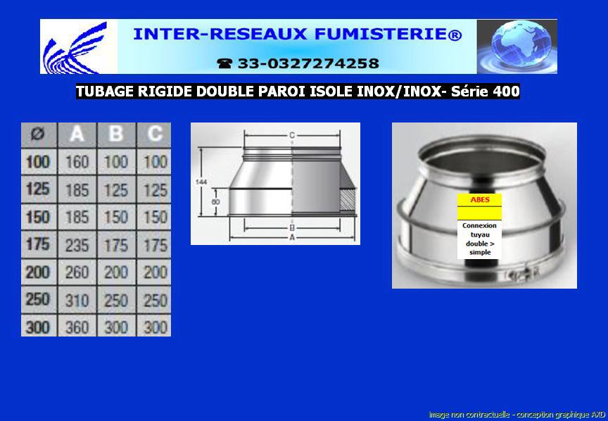 adaptateur double paroi isolé série 410 A utiliser pour raccorder un tubage rigide double paroi vers du tubage rigide simple paroi. Ce produit est un accessoire de raccordement pour du tuyau rigide double paroi servant à créer un conduit d'évacuation des fumées. Les diamètres indiqués sont spécifiés en millimètre. En cas de doute sur votre conception, contactez notre service technique au 33 - 03.27.27.42.58 Pour voir le plan non contractuel, cliquez ICI