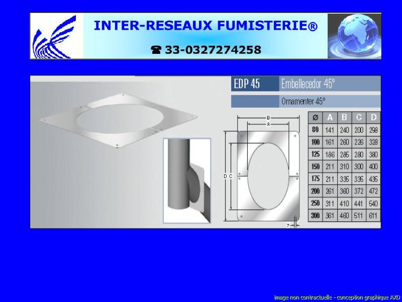 plaque de finition orientée à 45° double paroi isolé série 400 Ce produit est un accessoire de raccordement pour du tuyau rigide double paroi servant à créer un conduit d'évacuation des fumées. Les diamètres indiqués sont spécifiés en millimètre. En cas de doute sur votre conception, contactez notre service technique au 33 - 03.27.27.42.58 Pour voir le plan non contractuel, cliquez ICI