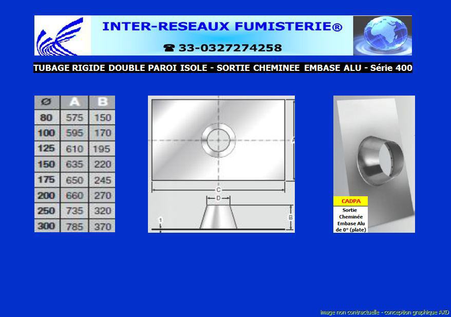sortie de cheminée base aluminium de 0° double paroi isolé série 400 Ce produit est un accessoire de raccordement pour du tuyau rigide double paroi servant à créer un conduit d'évacuation des fumées. Les diamètres indiqués sont spécifiés en millimètre. En cas de doute sur votre conception, contactez notre service technique au 33 - 03.27.27.42.58 Pour voir le plan non contractuel, cliquez ICI