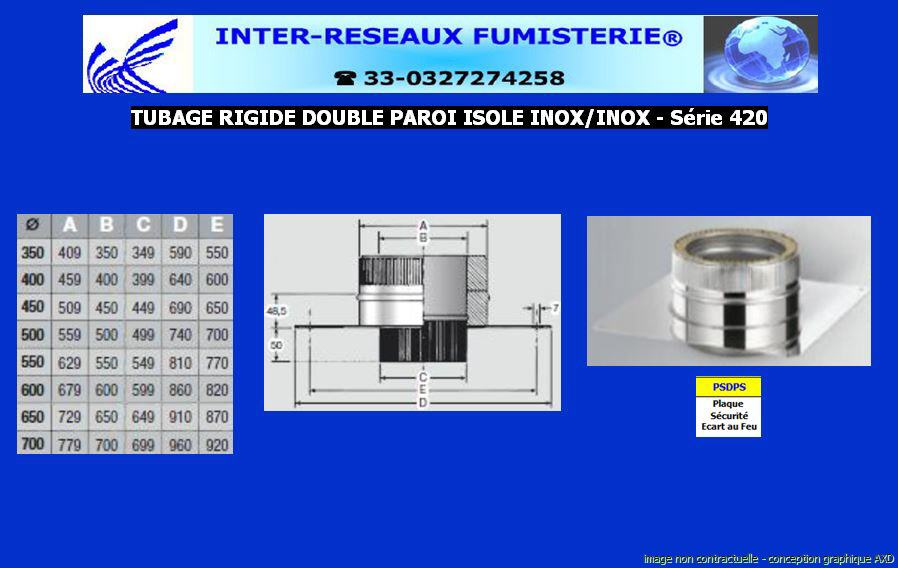 support de dalle ou plaque de démarrage de sol pour double paroi isolé série 420 Ce produit est un accessoire de raccordement pour du tuyau rigide double paroi servant à créer un conduit d'évacuation des fumées. Les diamètres indiqués sont spécifiés en millimètre. En cas de doute sur votre conception, contactez notre service technique au 33 - 03.27.27.42.58 Pour voir le plan non contractuel, cliquez ICI