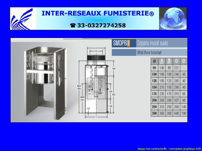 support mural de départ de sol pour double paroi isolé série 400 Ce produit est un accessoire de raccordement pour du tuyau rigide double paroi servant à créer un conduit d'évacuation des fumées. Les diamètres indiqués sont spécifiés en millimètre. En cas de doute sur votre conception, contactez notre service technique au 33 - 03.27.27.42.58 Pour voir le plan non contractuel, cliquez ICI