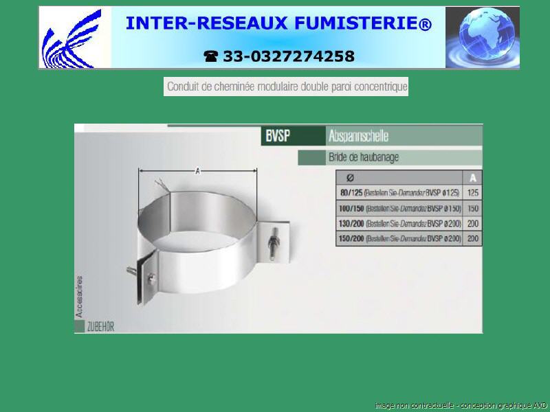 Bride d'haubanage pour double paroi concentrique inox Série CO330 Le conduit de cheminée BOFILL série DI est un conduit modulaire composé de deux cylindres concentriques en acier inoxydable Aisi-316L cylindre interne et Aisi-304 cylindre extérieur, soudés au laser longitudinalement (une garantie pour la fermeture correcte des cylindres et pour l'étanchéité parfaite de chacun d'eux). L'évacuation des gaz de l'appareil se fait par le conduit interne et l'entrée d'air pour la combustion, par la cavité formée entre les deux cylindres. Il possède une excellente résistance à la corrosion résultant de la teneur en soufre des gaz condensés et de la PdC du fioul. Il est équipé d'un système d'assemblage étanche type "clic" avec un joint en silicone dans le conduit interne qui résiste à des températures allant jusqu'à 200°C. Les diamètres indiqués sont spécifiés en millimètre. En cas de doute sur votre conception, contactez notre service technique au 33 - 03.27.27.42.58 Pour voir le plan non contractuel, cliquez ICI