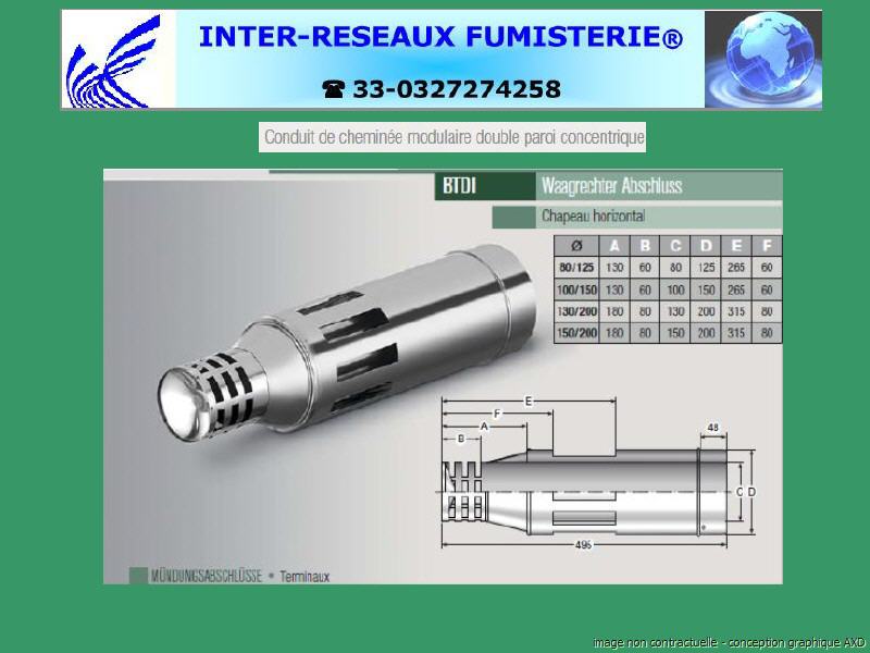 chapeau horizontal longueur 0,50 mètre double paroi concentrique inox Aisi-316L Série CO330 Le conduit de cheminée BOFILL série DI est un conduit modulaire composé de deux cylindres concentriques en acier inoxydable Aisi-316L cylindre interne et Aisi-304 cylindre extérieur, soudés au laser longitudinalement (une garantie pour la fermeture correcte des cylindres et pour l'étanchéité parfaite de chacun d'eux). L'évacuation des gaz de l'appareil se fait par le conduit interne et l'entrée d'air pour la combustion, par la cavité formée entre les deux cylindres. Il possède une excellente résistance à la corrosion résultant de la teneur en soufre des gaz condensés et de la PdC du fioul. Il est équipé d'un système d'assemblage étanche type "clic" avec un joint en silicone dans le conduit interne qui résiste à des températures allant jusqu'à 200°C. Les diamètres indiqués sont spécifiés en millimètre. En cas de doute sur votre conception, contactez notre service technique au 33 - 03.27.27.42.58 Pour voir le plan non contractuel, cliquez ICI