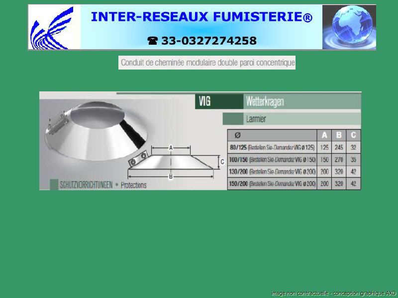Larmier pour double paroi concentrique inox Série CO330 Le conduit de cheminée BOFILL série DI est un conduit modulaire composé de deux cylindres concentriques en acier inoxydable Aisi-316L cylindre interne et Aisi-304 cylindre extérieur, soudés au laser longitudinalement (une garantie pour la fermeture correcte des cylindres et pour l'étanchéité parfaite de chacun d'eux). L'évacuation des gaz de l'appareil se fait par le conduit interne et l'entrée d'air pour la combustion, par la cavité formée entre les deux cylindres. Il possède une excellente résistance à la corrosion résultant de la teneur en soufre des gaz condensés et de la PdC du fioul. Il est équipé d'un système d'assemblage étanche type "clic" avec un joint en silicone dans le conduit interne qui résiste à des températures allant jusqu'à 200°C. Les diamètres indiqués sont spécifiés en millimètre. En cas de doute sur votre conception, contactez notre service technique au 33 - 03.27.27.42.58 Pour voir le plan non contractuel, cliquez ICI