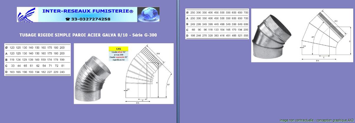 Coude 45° pour conduit évacuation fumées simple paroi acier galvanisé - Série G300 - Minimum de commande = 4 unités par référence Ce produit est un accessoire de raccordement pour du tuyau rigide simple paroi servant à créer un conduit d'évacuation des fumées. Les diamètres indiqués sont spécifiés en millimètre. En cas de doute sur votre conception, contactez notre service technique au 33 - 03.27.27.42.58 Pour voir le plan, cliquez ICI
