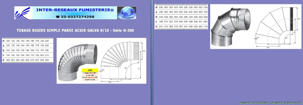 Coude 90° pour conduit évacuation fumées simple paroi acier galvanisé - Série G300 - Minimum de commande = 4 unités par référence Ce produit est un accessoire de raccordement pour du tuyau rigide simple paroi servant à créer un conduit d'évacuation des fumées. Les diamètres indiqués sont spécifiés en millimètre. En cas de doute sur votre conception, contactez notre service technique au 33 - 03.27.27.42.58 Pour voir le plan, cliquez ICI