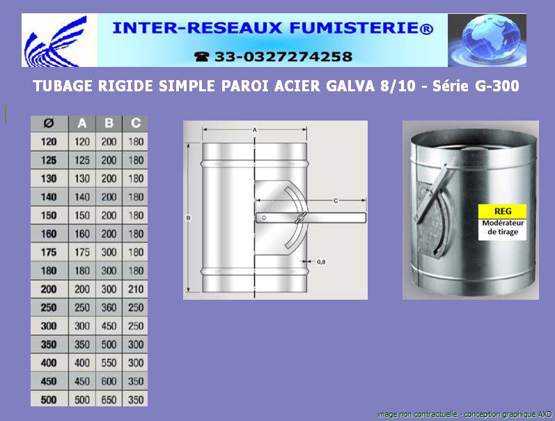 Modérateur de tirage pour conduit évacuation fumées simple paroi acier galvanisé - Série G300 Ce produit est un accessoire de raccordement pour du tuyau rigide simple paroi servant à créer un conduit d'évacuation des fumées. Les diamètres indiqués sont spécifiés en millimètre. En cas de doute sur votre conception, contactez notre service technique au 33 - 03.27.27.42.58 Pour voir le plan, cliquez ICI