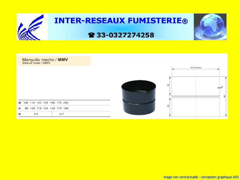 (manchon mâle pour conduit évacuation fumées simple paroi vitrifié à 900° noir brillant) Ce produit est un accessoire de raccordement pour du tuyau rigide simple paroi servant à créer un conduit d'évacuation des fumées. Les diamètres indiqués sont spécifiés en millimètre. En cas de doute sur votre conception, contactez notre service technique au 33 - 03.27.27.42.58 Pour voir le plan non contractuel, cliquez ICI