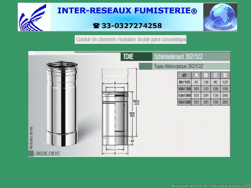 tuyau extensible double paroi concentrique inox Aisi-316L Série CO330 Le conduit de cheminée BOFILL série DI est un conduit modulaire composé de deux cylindres concentriques en acier inoxydable, soudés au laser longitudinalement (une garantie pour la fermeture correcte des cylindres et pour l'étanchéité parfaite de chacun d'eux). L'évacuation des gaz de l'appareil se fait par le conduit interne et l'entrée d'air pour la combustion, par la cavité formée entre les deux cylindres. Il possède une excellente résistance à la corrosion résultant de la teneur en soufre des gaz condensés et de la PdC du fioul. Il est équipé d'un système d'assemblage étanche type "clic" avec un joint en silicone dans le conduit interne qui résiste à des températures allant jusqu'à 200°C. Les diamètres indiqués sont spécifiés en millimètre. En cas de doute sur votre conception, contactez notre service technique au 33 - 03.27.27.42.58 Pour voir le plan non contractuel, cliquez ICI