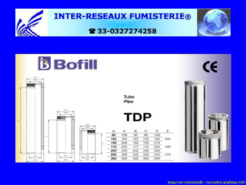 tuyau inox/inox 304 double paroi série 400 Le conduit de cheminée polycombustible modulaire BOFILL est fondamentalement constitué de deux cylindres concentriques en acier inoxydable fermés aux extrémités, et d'une coquille isolante remplie de laine de roche d'une épaisseur de 30 mm et d'une densité de 150 kg/m3. Ce produit est du tuyau rigide double paroi pour créer un conduit d'évacuation des fumées. Les diamètres indiqués sont spécifiés en millimètre. En cas de doute sur votre conception, contactez notre service technique au 33 - 03.27.27.42.58 Pour voir le plan non contractuel, cliquez ICI