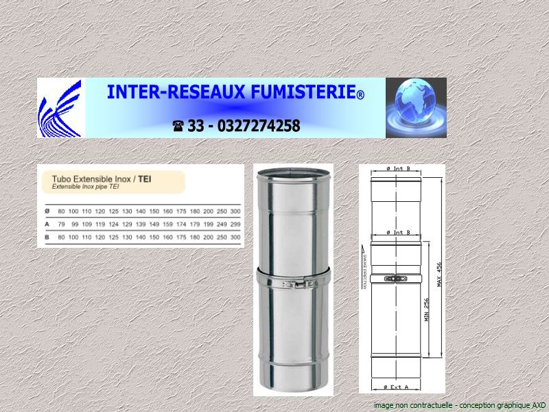 (tuyau simple paroi inox Aisi-304 Série 200 extensible de 256 m/m à 456 m/m pour conduit évacuation fumées OU de ventilation) Ce produit est du tuyau rigide simple paroi pour créer un conduit d'évacuation des fumées OU de ventilation. Les diamètres indiqués sont spécifiés en millimètre. En cas de doute sur votre conception, contactez notre service technique au 33 - 03.27.27.42.58 Pour voir le plan non contractuel, cliquez ICI