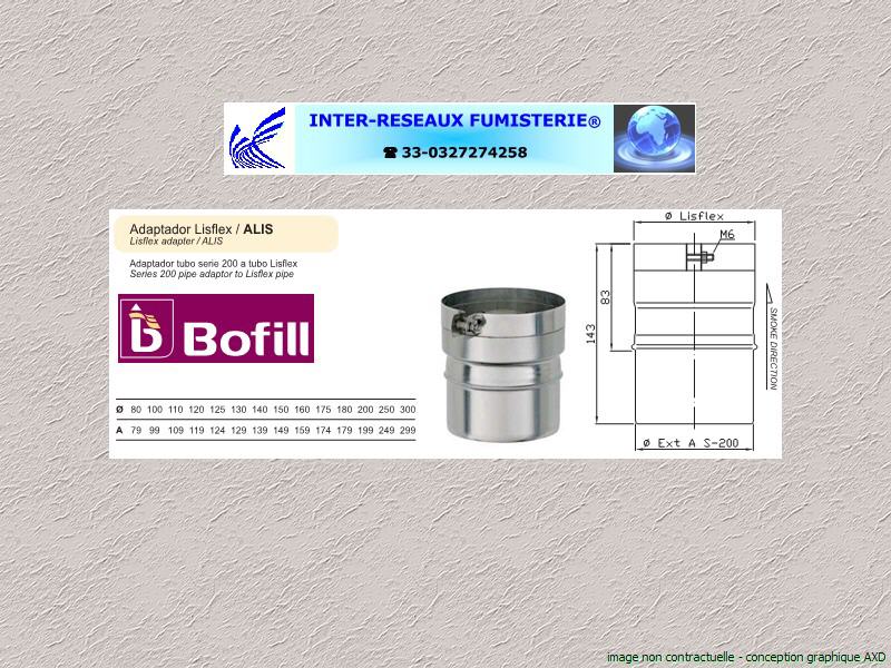 (adaptateur INTERLIS pour conduit évacuation fumées simple paroi rigide>flexible) Ce produit est un accessoire de raccordement pour du tuyau rigide simple paroi servant à créer un conduit d'évacuation des fumées. Les diamètres indiqués sont spécifiés en millimètre. En cas de doute sur votre conception, contactez notre service technique au 33 - 03.27.27.42.58 Pour voir le plan non contractuel, cliquez ICI